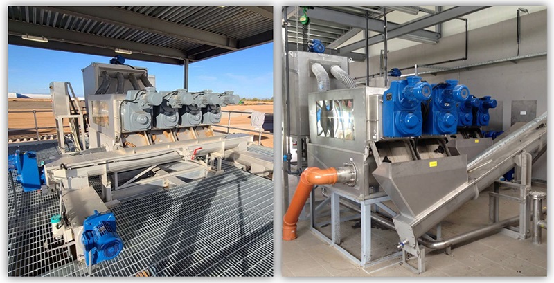 The main body of the sludge dewatering machine can be divided into two parts: in the first part where gravity concentration occurs, the screw will rotate downward and push out a mixture of water and solid materials that are below it.