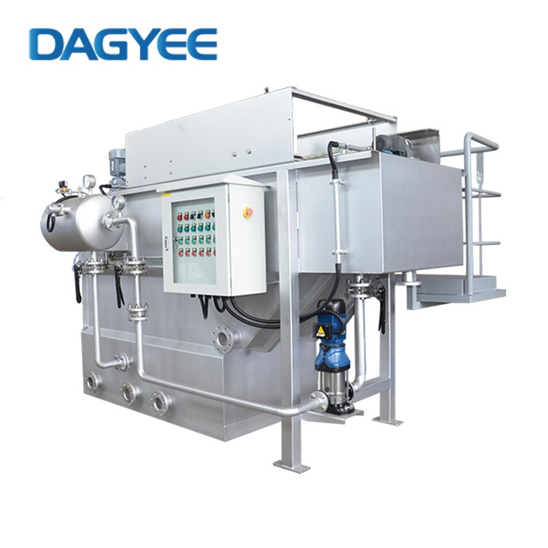 Air flotation separation technology of DAGYEE DAF dissolved air flotation dissolved air into water at certain working pressure. In the process, pressurized water is saturated with dissolved air and is discharged into a flotation vessel. The microscopic air bubbles produced by released air attach to suspended solids and float them to the surface, forming a sludge blanket. A scoop removes the thickened sludge. Finally, it complete purifies the water.
