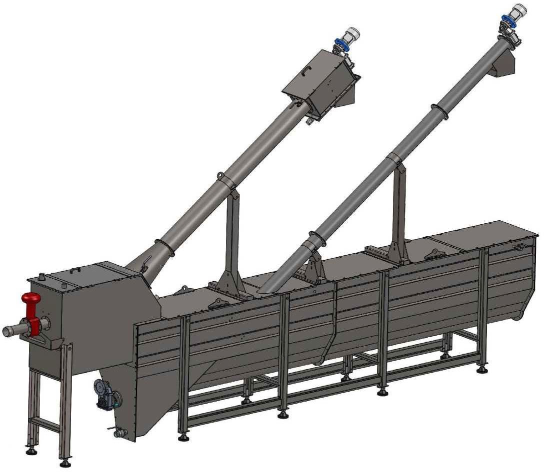 The water which has still solid materials in smaller sizes flows through the sedimentation tank. The particles are settled by time and a horizontal screwconveyor transports them to the collection hopper.